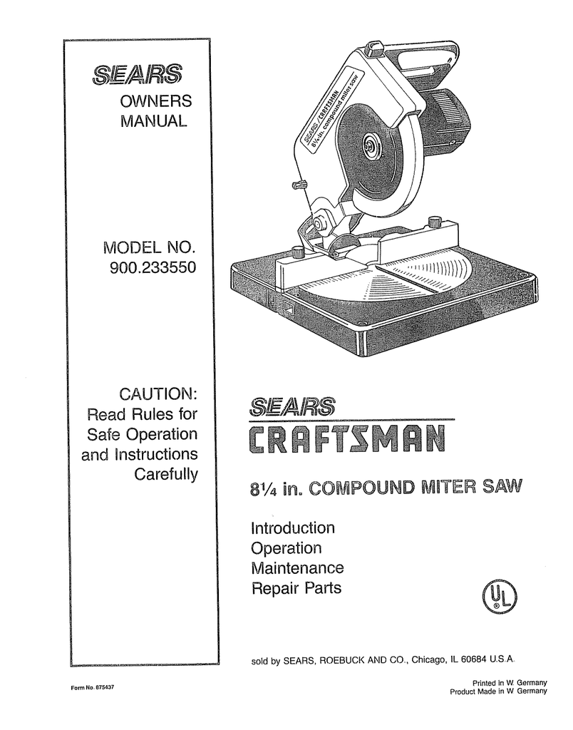 Sears Craftsman 10 Inch Compound Miter Saw Owners Manual